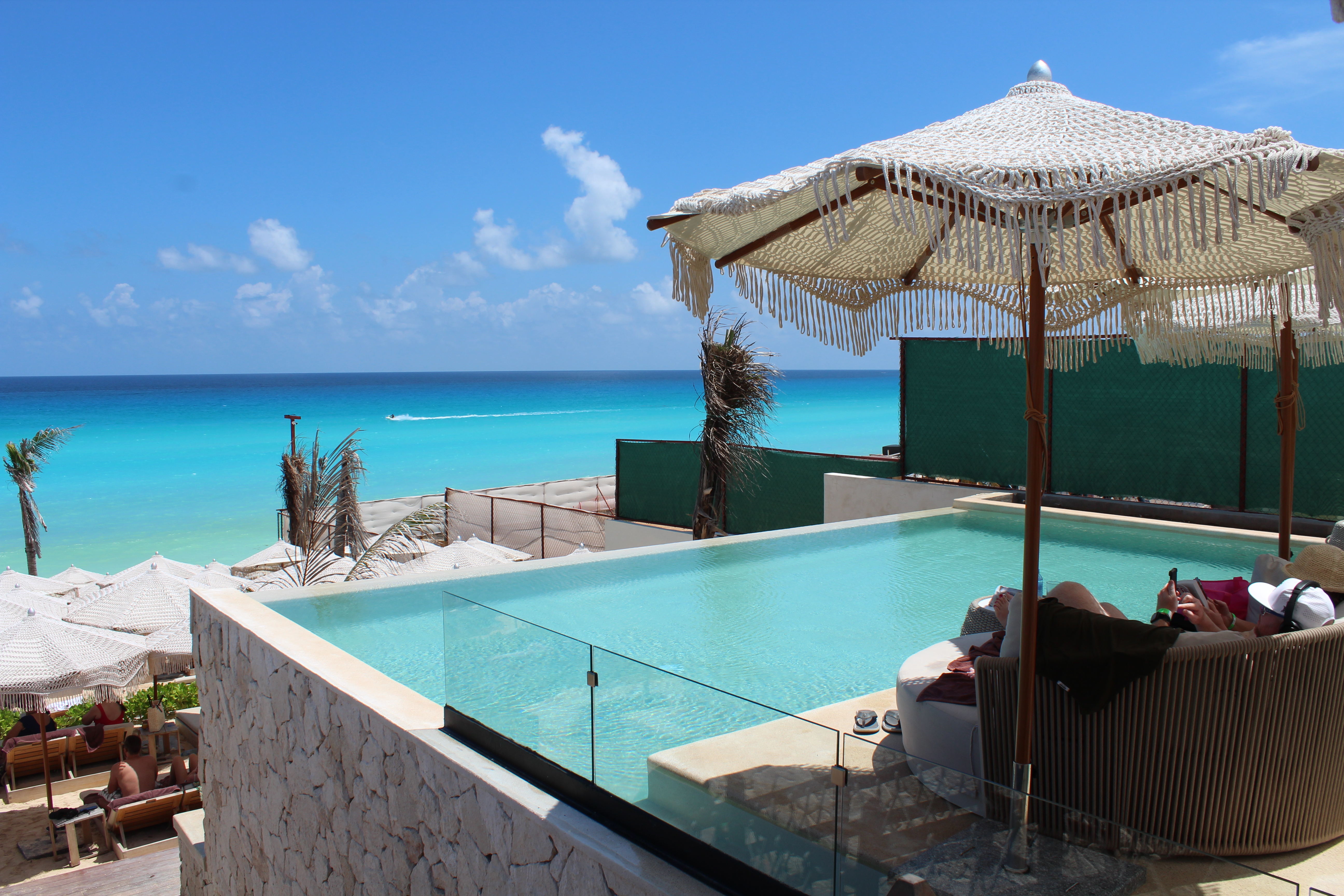 Three pools in total: two main ground-level pools (one open until midnight) and the longest rooftop infinity pool in Cancun (about 295 feet), offering 360° views — exclusive to Vantage Club guests.